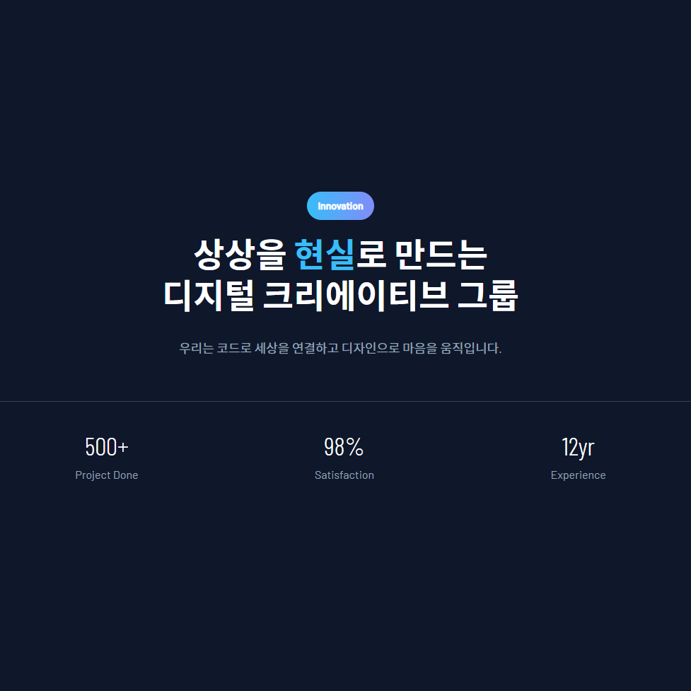 이 섹션은 세련된 감각과 기술적 정체성을 동시에 드러내도록 설계되었습니다. 심해를 연상시키는 깊은 다크 네이비 톤의 배경은 안정감과 전문성을 전달하며, 그 위에서 빛나는 블루 그라데이션 포인트는 ‘Innovation(혁신)’이라는 핵심 가치를 시각적으로 강조합니다. “상상을 현실로 만드는”이라는 강력한 메시지를 중앙에 배치함으로써, 방문자가 페이지에 접속하자마자 브랜드의 존재 목적을 명확히 인지할 수 있도록 유도합니다.