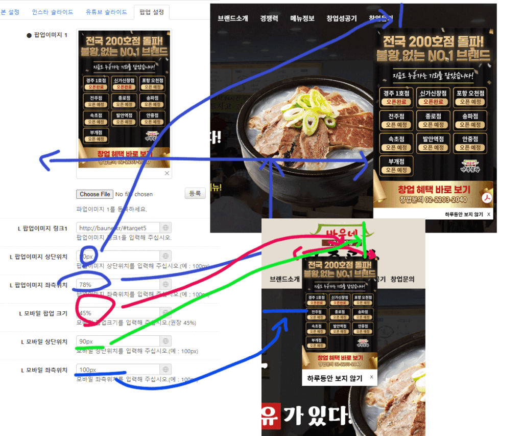 팝업이미지 좌측위치 : 좌측에서 어느정도 위치에 두는가를 설정